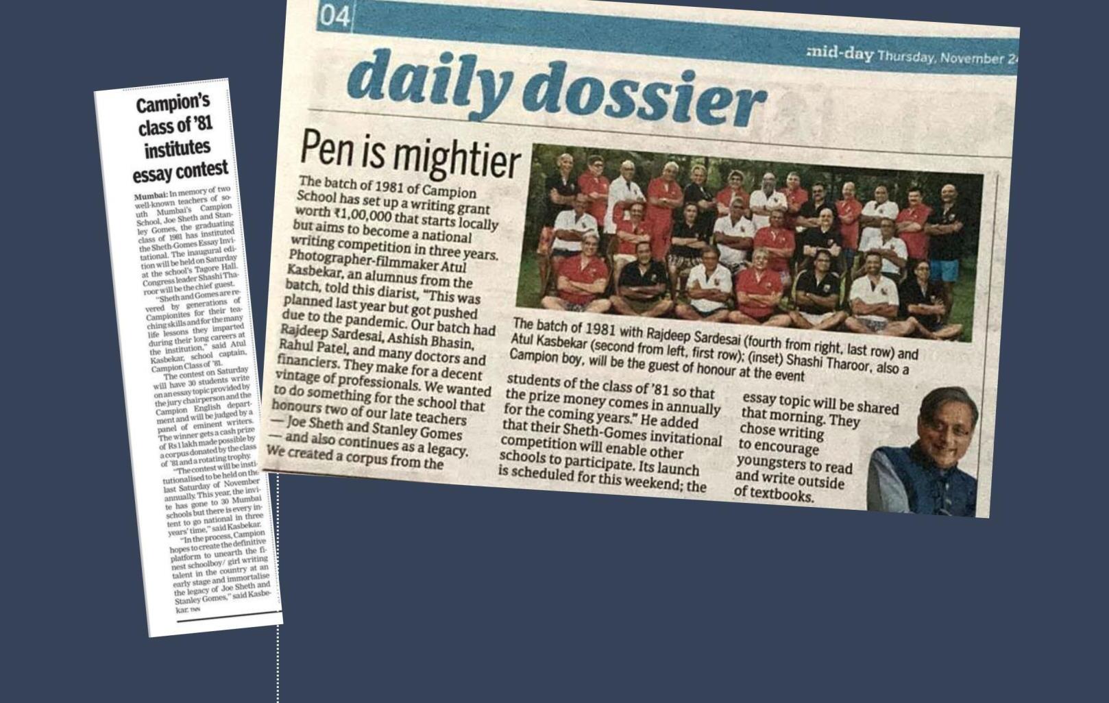 The inaugural edition of the Sheth-Gomes Essay Invitational was held in 2022. An essay competition, open by invitation extended by Campion to schools in the Mumbai and Thane district.
