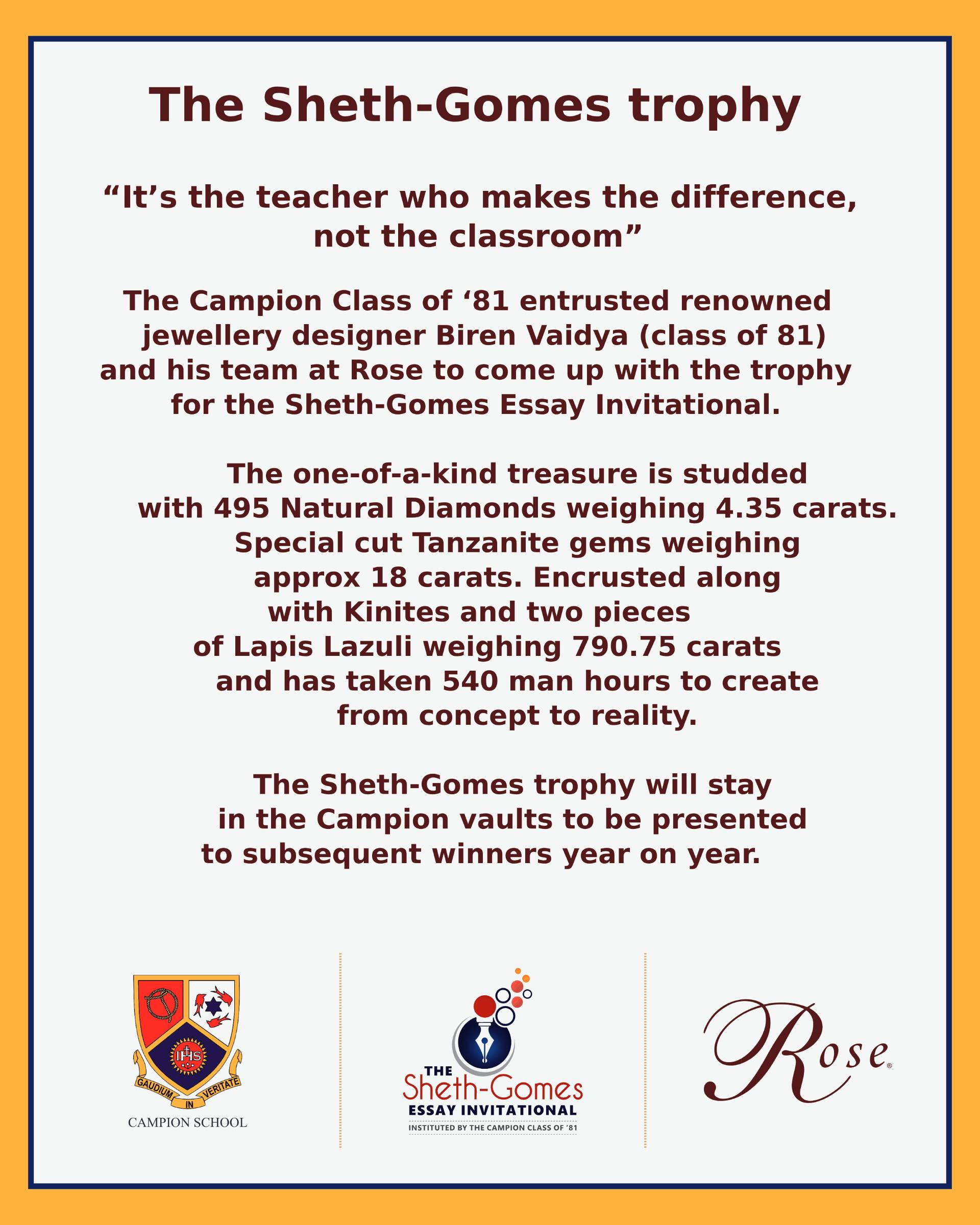 When the Class of '81 decided to have an essay-writing competition in memory of Mr. Stanley Gomes and Mr. Joseph Sheth, Biren Vaidya was given the opportunity to create a trophy for the same.